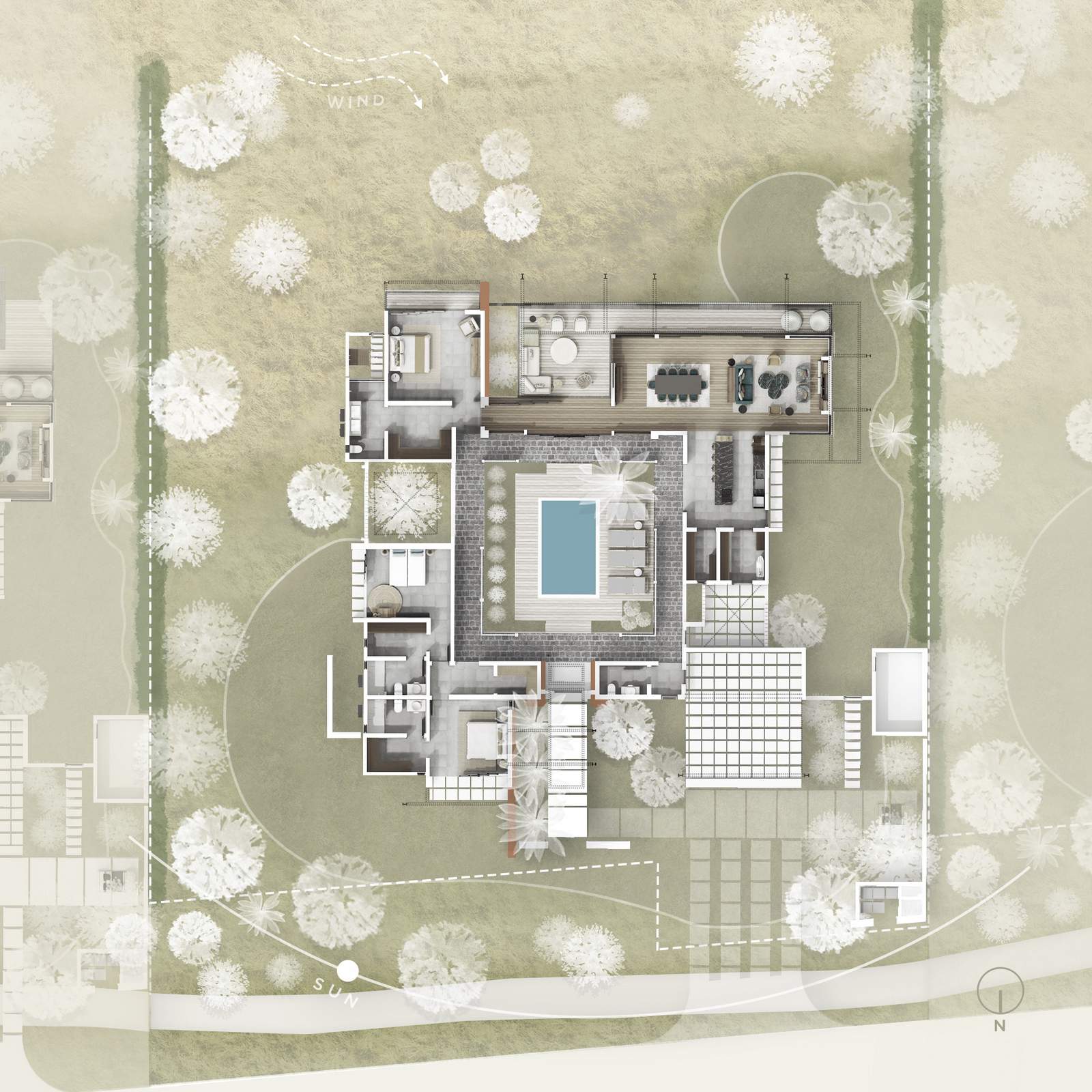 - - de grands toits, des écrans coulissants et une parfaite intégration des villas dans leur environnement naturel seront privilégiés pour filtrer les rayons du soleil et minimiser l’impact des fortes pluies,